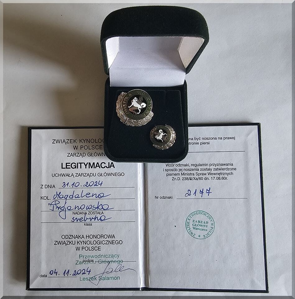 Po raz kolejny zostałam nagrodzona przez Związek Kynologiczny w Polsce,tym razem Srebrną Odznaką Honorową Związku Kynologicznego w Polsce za działalność na rzecz Związku,a także za szczególne osiągnięcia hodowlane!