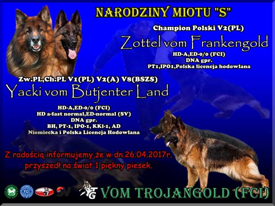 W dniu wczorajszym nasz synek Nazar vom Trojangold na Krajowej Wystawie Owczarków Niemieckich w Gdyni oceniany przez sędziego W.Kosmalskiego (WUSW) w klasie młodzieży zajął I lokatę z oceną doskonałą,zdobył tytuły Zwycięzca Młodzieży oraz Najlepszy Junior w Rasie.