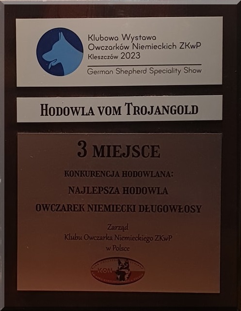 Hoss vom Trojangold ( Miranda vom Trojangold & Fajter z Trojańskiego Lasu) który w klasie championów zajął I lokatę z oceną doskonałą,otrzymał CWC oraz Res.CACIB,Izzy vom Trojangold (Dila vom Trojangold & Vick Mario Grande) który w klasie otwartej zajął II lokatę z oceną doskonałą,Maya vom Trojangold (Miranda vom Trojangold & Enzo vom Trojangold) która w klasie szczeniąt zajęła I lokatę z oceną wybitnie obiecującą,następnie wygrywając porównanie z psem otrzymała tytuł Najlepsze Szczenię w Rasie.