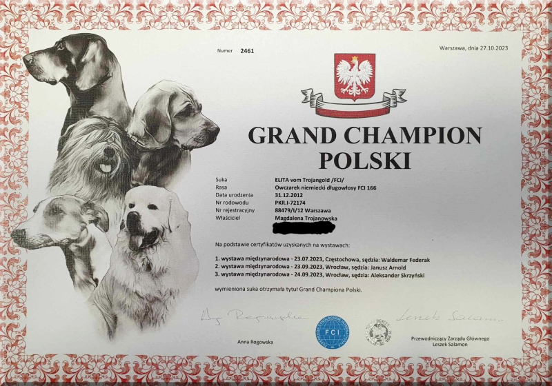 Z nieukrywaną radością informujemy,że nasza córeczka Elita vom Trojangold (Yacki vom Butjenter Land & Orion Mavic Poland) została Grand Championem Polski!